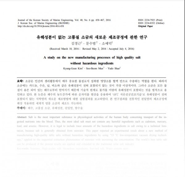 인하고 있다. 본 논문은 해수의 농도증가에 따른 순차석출 현상을 응용하여 ‘15℃ 저온진공건조기술’로 유해성분이 전혀