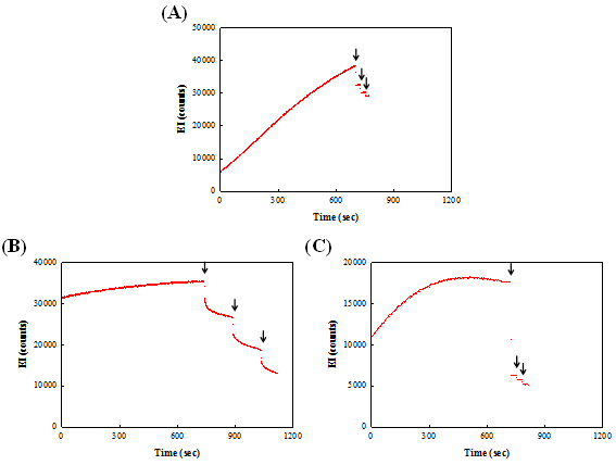 인위적으로 활성산소를 발생시킨 후 천일염(A), 구운소금(B), 죽염(C) 똑같은 양을 첨가하였을 때 활성산소 제거효과, 화살표는 소금첨가를 뜻함. 천일염보다 구운소금, 구운소금보다는 죽염을 첨가하였을 때 활성산소가 급격하게 감소함을 알 수 있다.